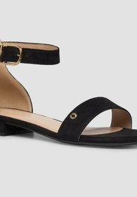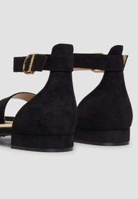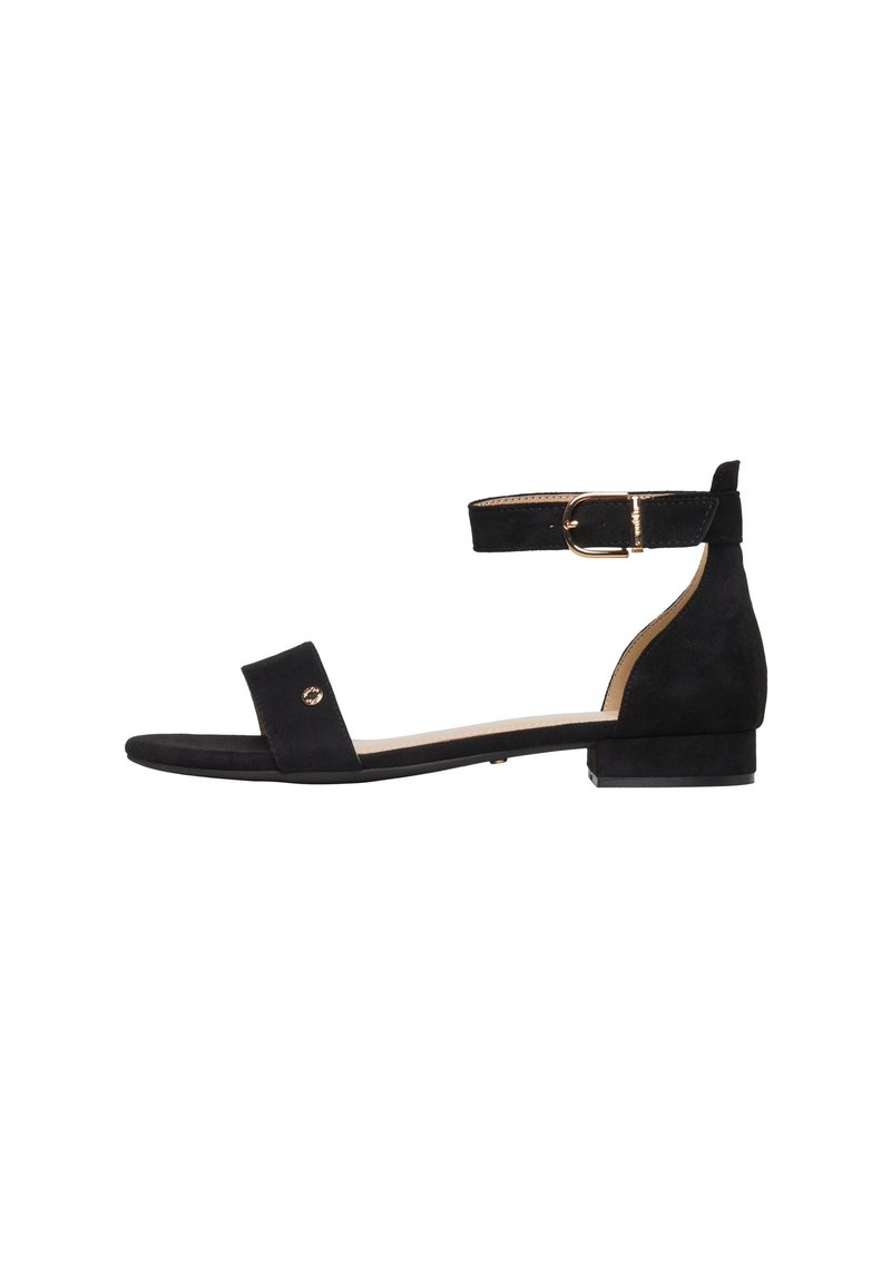 Czarna płaska sandała z paskiem wokół kostki i złotą sprzączką, odkrytymi palcami i niskim obcasem typu słupek.