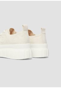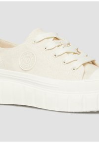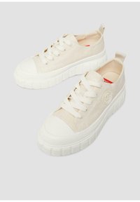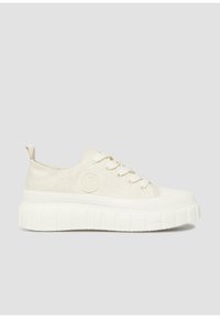 Beżowy, niskoprofilowy tenisówka z płótna z grubą białą podeszwą na platformie, sznurowanym przodem, okrągłym logo po boku oraz pętelką przy pięcie.