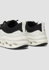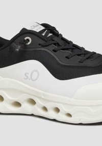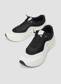 Czarno-biały sportowy sneaker z zapięciem na sznurówki, oddychającą siateczkową cholewką oraz grubą białą podeszwą z okrągłymi wycięciami.