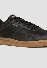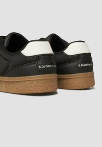 Czarny niski sneaker z brązową fakturowaną podeszwą, czarnymi sznurowadłami, białym paskiem na pięcie i małą metką marki z boku, widoczny z zewnętrznej strony.