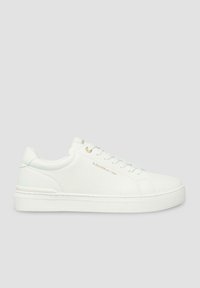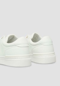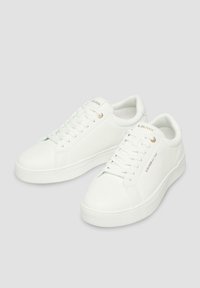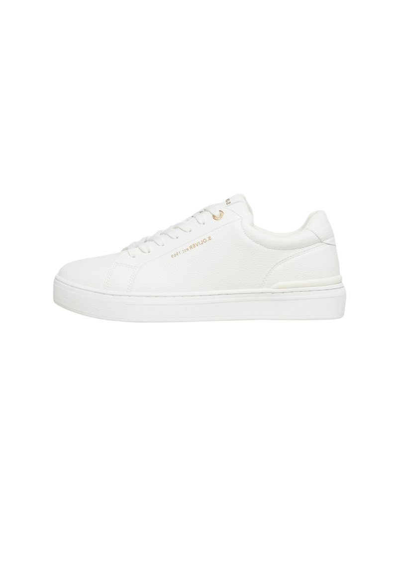 Białe niskie trampki z sznurowanym zapięciem, złotym napisem po boku "s.Oliver est. 1969" i płaską gumową podeszwą.