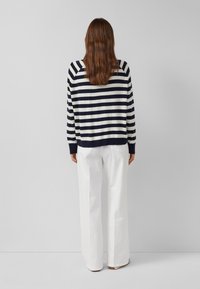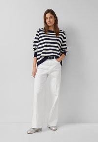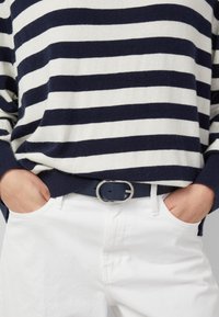 Kobieta o brązowych włosach, ubrana w granatowo-biały sweter w paski, białe spodnie i granatowy pasek na jednolitym szarym tle.
