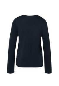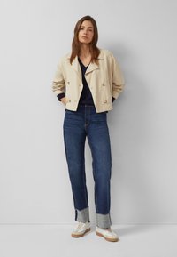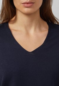 Kobieta o długich brązowych włosach, ubrana w granatową bluzkę z długim rękawem i niebieskie dżinsy, stojąca na tle jasnoszarego tła.