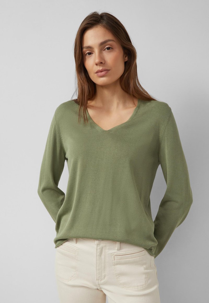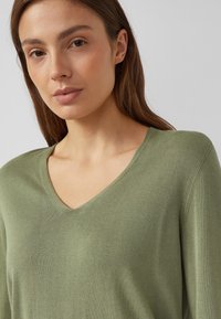 Kobieta z jasnobrązowymi włosami, ubrana w oliwkowozielony sweter z dekoltem w serek i jasnobeżowe spodnie, na szarym jednolitym tle.
