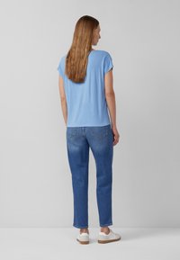Kobieta o prostych jasnobrązowych włosach, ubrana w jasnoniebieską bluzkę z krótkim rękawem i niebieskie jeansy, stoi z jedną ręką w kieszeni na tle szarej ściany.