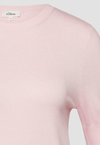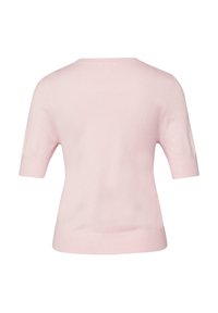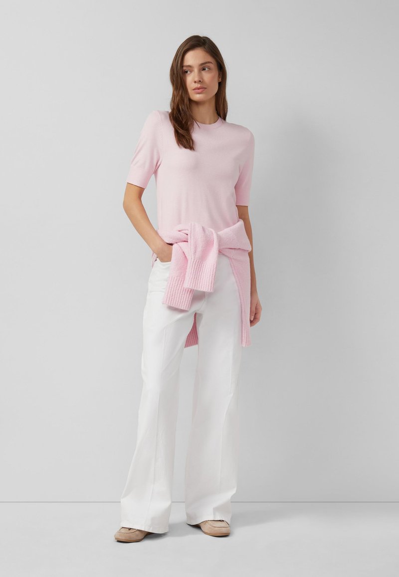 Kobieta stojąca w białych spodniach o szerokich nogawkach, jasnoróżowym topie z krótkim rękawem oraz różowym swetrze przewiązanym wokół talii, ubrana w beżowe buty.