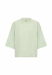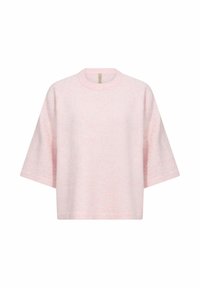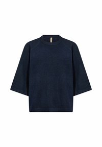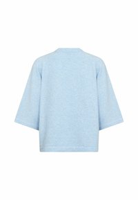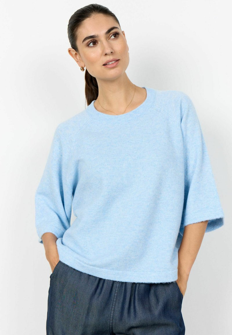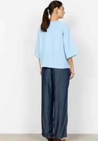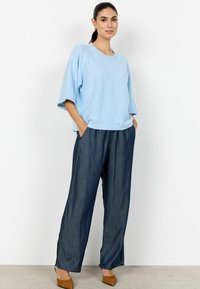 Kobieta o ciemnych włosach związanych w kucyk, ubrana w jasnoniebieski sweter z krótkim rękawem i ciemne spodnie, patrząca lekko na bok z rękami w kieszeniach.
