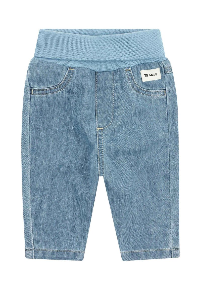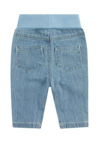 Jasnoniebieskie jeansy dla malucha z elastycznym pasem, przednimi kieszeniami i małą metką marki na prawej kieszeni.