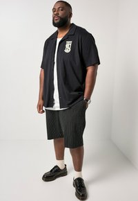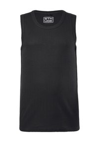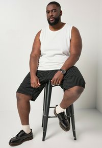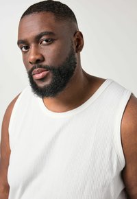 Mężczyzna z brodą w białej koszulce bez rękawów i czarnych spodniach w cienkie prążki, stojący na tle jednolitego jasnego tła, patrzący w kamerę.