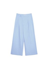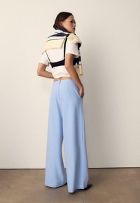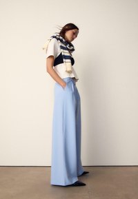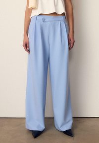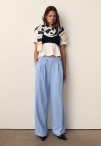 Zbliżenie osoby noszącej jasnoniebieskie spodnie z wysokim stanem, fałdami i zapinanym na guziki pasem, z ręką w lewej kieszeni oraz białym topem.