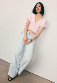 Młoda kobieta z krótkimi czarnymi włosami, ubrana w jasnoróżową bluzkę z dekoltem w serek i jasnoniebieskie dżinsy, poprawia pas spodni opierając się o jednolitą ścianę.