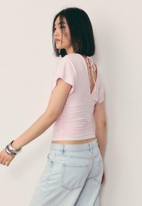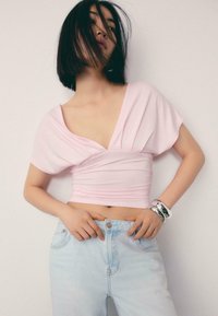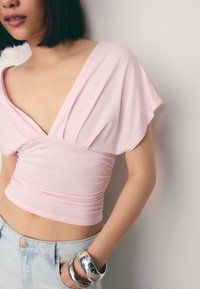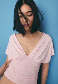 Top z dekoltem w serek, drapowanym efektem na piersi i luźnymi krótkimi rękawami w stylu peleryny. Odkryte plecy z regulowanymi sznurkami i wiązaniem. Marszczony detal materiałowy po bokach. Dostępny w różnych kolorach.