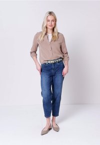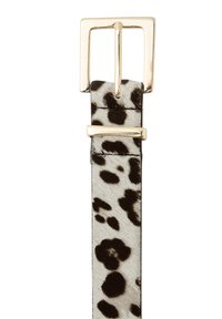 Kobieta o długich blond włosach nosi białą koszulę, niebieskie dżinsy, pasek w panterkę oraz brązową zamszową kurtkę zarzuconą na ramiona.