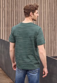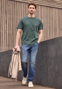 Mężczyzna w zielono-szarej pasiastce z krótkim rękawem i niebieskich dżinsach, trzymający beżowy kapelusz w lewej ręce, na jednolitym tle.
