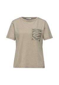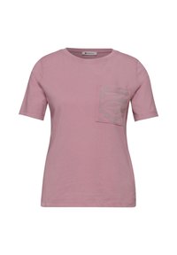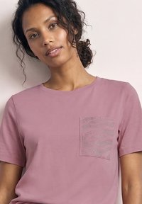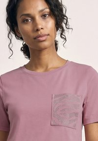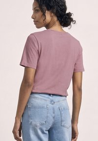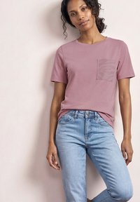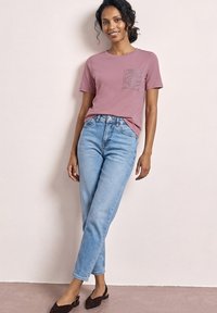 Kobieta ubrana w wrzosową koszulkę z krótkim rękawem z wzorzystą kieszenią i jasnoniebieskie dżinsy, stojąca na tle jednolitej jasnej ściany.