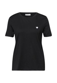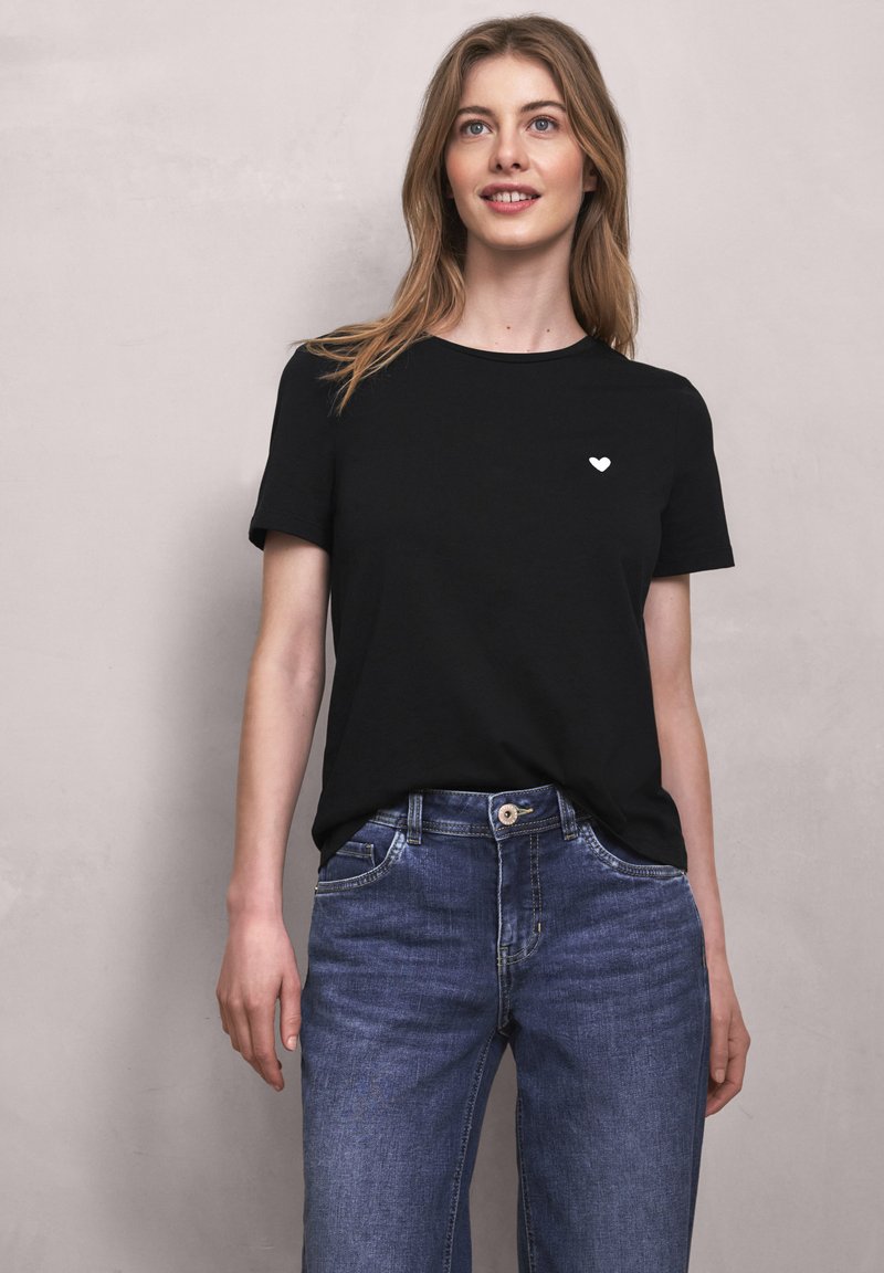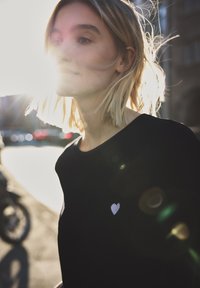Młoda kobieta o długich włosach, ubrana w czarny t-shirt z małym białym sercem na piersi i niebieskie dżinsy, lekko się uśmiechająca, stojąca.