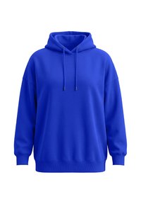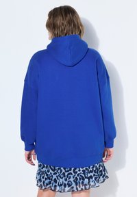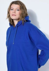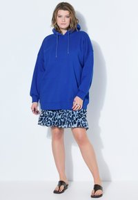 Młoda osoba o falowanych włosach ubrana w niebieską bluzę z kapturem i spódnicę w wzory, pozująca z jedną ręką lekko podciągającą bluzę.