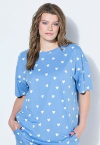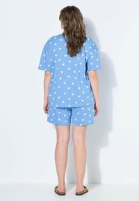 Kobieta o falowanych włosach, ubrana w jasnoniebieski komplet piżamy z białymi wzorami serc, z pierścionkami na palcach i niebieskim lakierem do paznokci, patrząca w prawo.