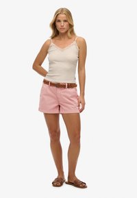 Kobieta ubrana w różowe szorty z brązowym plecionym paskiem i brązowe klapki, stojąca na białym tle.