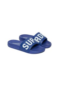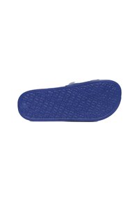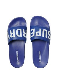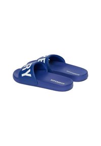 Niebieska klapka na płaskiej podeszwie z szerokim paskiem ozdobionym dużymi białymi literami "RY", płaską podeszwą i teksturowaną wkładką.