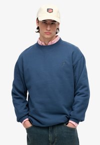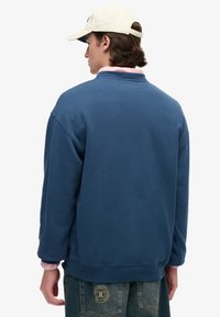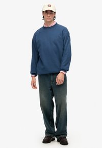 Młody mężczyzna w jasnobeżowej czapce, różowej koszuli z kołnierzykiem, niebieskiej bluzie z okrągłym dekoltem i niebieskich dżinsach, z rękami w kieszeniach.