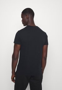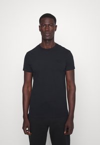 Czarna bawełniana koszulka z okrągłym dekoltem i krótkimi rękawami, z subtelnym haftowanym logo na piersi, gładką teksturą i dopasowanym krojem.
