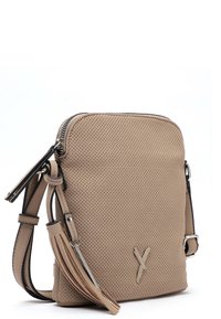 Kobieta ubrana w czarną bluzkę z długim rękawem, w kratkę spodnie, białe trampki, niesie beżową torebkę na ramię z detalem w postaci frędzla, stoi na jednolitym tle.