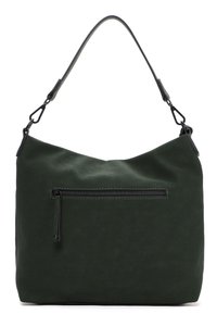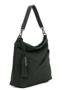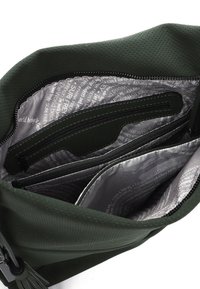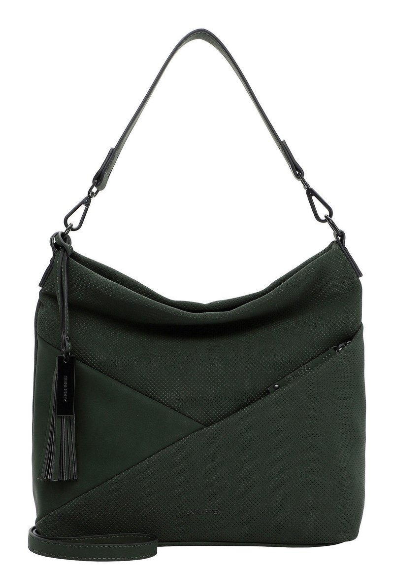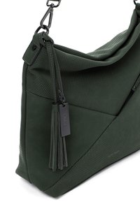 Ciemnozielona torba wykonana z teksturowanej tkaniny o luźnym kroju. Posiada kieszeń na suwak, ozdobę w postaci frędzla oraz regulowany pasek na ramię.