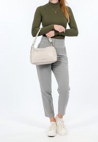 Kobieta ubrana w oliwkowozielony prążkowany golf, szare spodnie z wysokim stanem, białe trampki, trzymająca beżową torebkę na ramię z plecionym paskiem.