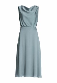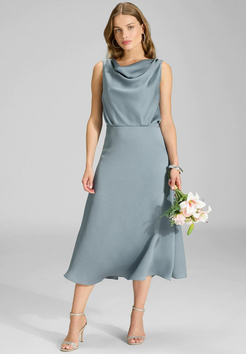 Sukienka bez rękawów z golfem w miękkim niebieskim materiale, z lejącą się spódnicą o długości midi. Modelka trzyma bukiet kwiatów. Srebrne sandały na obcasie z odkrytymi palcami.