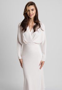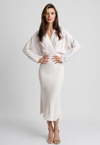 Długa, dopasowana sukienka z miękkiego, jasnoróżowego materiału. Ma głęboki dekolt w kształcie litery V i zwiewne rękawy. Gładka tekstura z rozkloszowanym dołem. Połączona z beżowymi szpilkami.