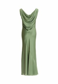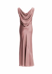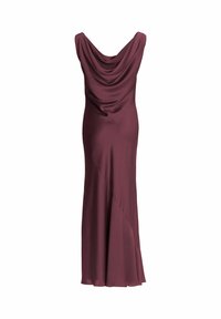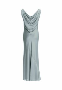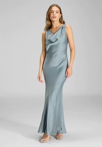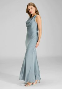 Satynowa suknia wieczorowa w jasnoniebieskim kolorze z dekoltem typu kapturek, bez rękawów i dopasowaną sylwetką rozszerzającą się ku dołowi.