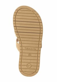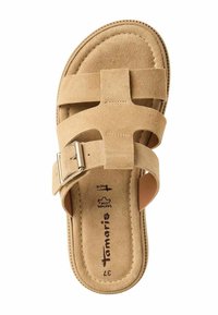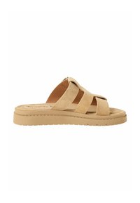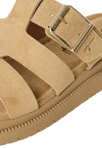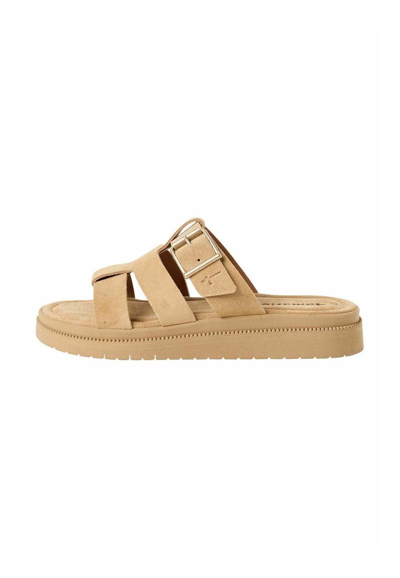 Zamszowy, brązowy klapek z dwiema skrzyżowanymi paskami i ozdobną sprzączką. Płaska podeszwa z teksturowanym bieżnikiem dla lepszej przyczepności i komfortu.