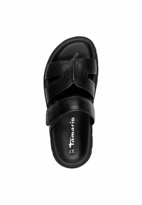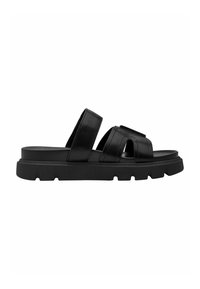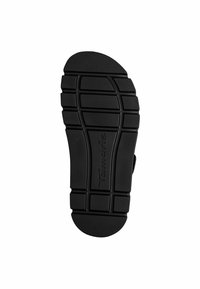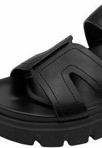 Czarne sandały z dwiema szerokimi paskami, wykonane z gładkiej skóry, wyposażone w teksturowaną podeszwę i regulowane zapięcie na rzep.