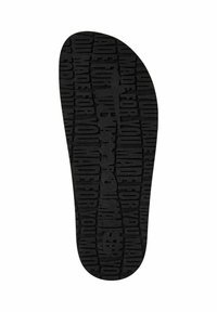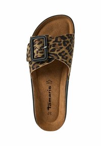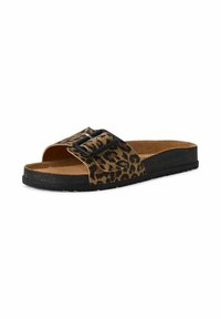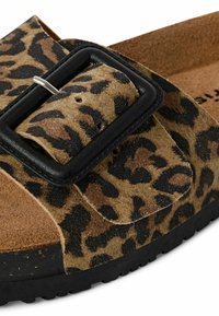 Klapki na płaskim obcasie w cętki lamparta z brązową cholewką z zamszu, czarną regulowaną klamrą i miękką korkową wkładką. Czarna gumowa podeszwa.