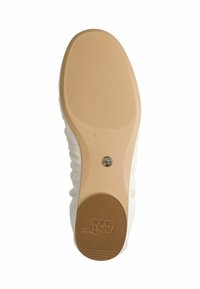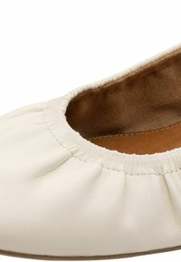 Kremowy baletka z miękkiej skóry z marszczonym wzorem na cholewce, okrągłym noskiem i małą pętelką z tyłu. Posiada płaską podeszwę i gładką teksturę.