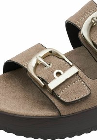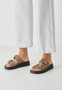 Brązowe sandały na koturnie zamszowe z dwoma regulowanymi paskami, metalowymi klamrami i ciemną, fakturowaną podeszwą. W zestawieniu z białymi szerokimi spodniami.