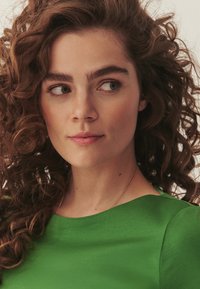 Kobieta o kręconych włosach, ubrana w zieloną koszulkę z krótkim rękawem i ciemne spodnie, spoglądająca lekko na bok na tle jednolitego tła.