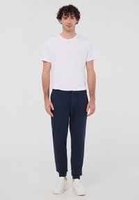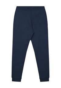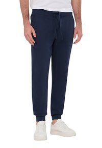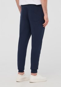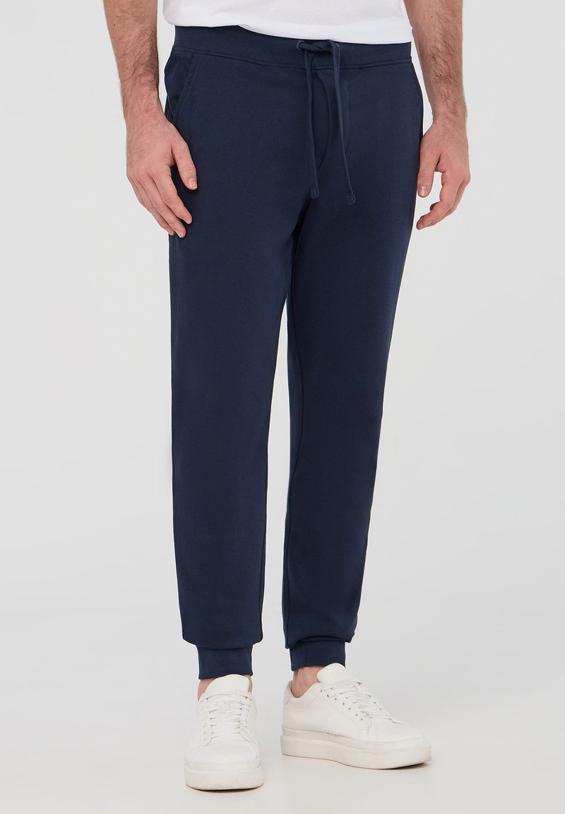 Granatowe spodnie dresowe z miękkiego materiału, z elastycznym pasem na sznurek, kieszeniami bocznymi oraz ściągaczami na kostkach.
