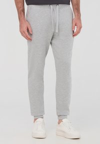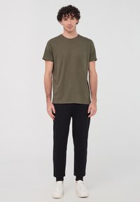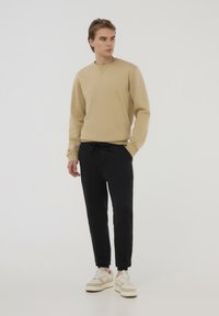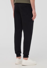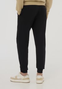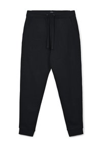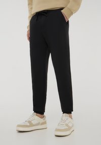 Czarne spodnie dresowe wykonane z miękkiego materiału, z elastycznym pasem wciąganym z sznurkiem, zwężanymi nogawkami i prążkowanymi mankietami. Zestawione z białymi sneakerami.