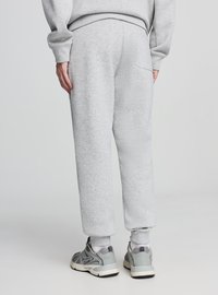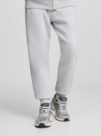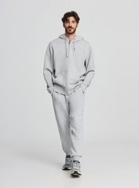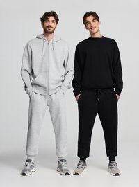Dwóch mężczyzn nosi dopasowane casualowe stroje: jasnoszara bluza z kapturem na zamek z pasującymi spodenkami dresowymi oraz czarna bluza z okrągłym dekoltem z czarnymi joggerami.