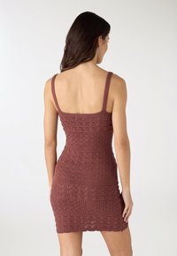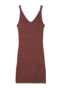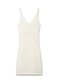 Dzianinowa sukienka damska w jednolitym kolorze z dopasowaną sylwetką i długością powyżej kolan. Model na ramiączkach z dekoltem w serek podkreśla figurę, a ażurowy pasiasty detal dodaje wyrafinowanego akcentu. Idealna z sandałami i dodatkami na wieczorne wyjścia lub specjalne okazje, ale także z trampkami do miejskiego looku. by Terranova!
