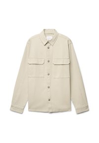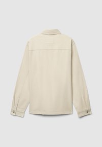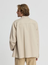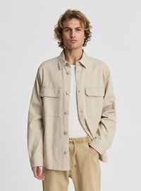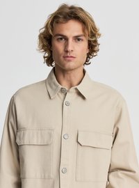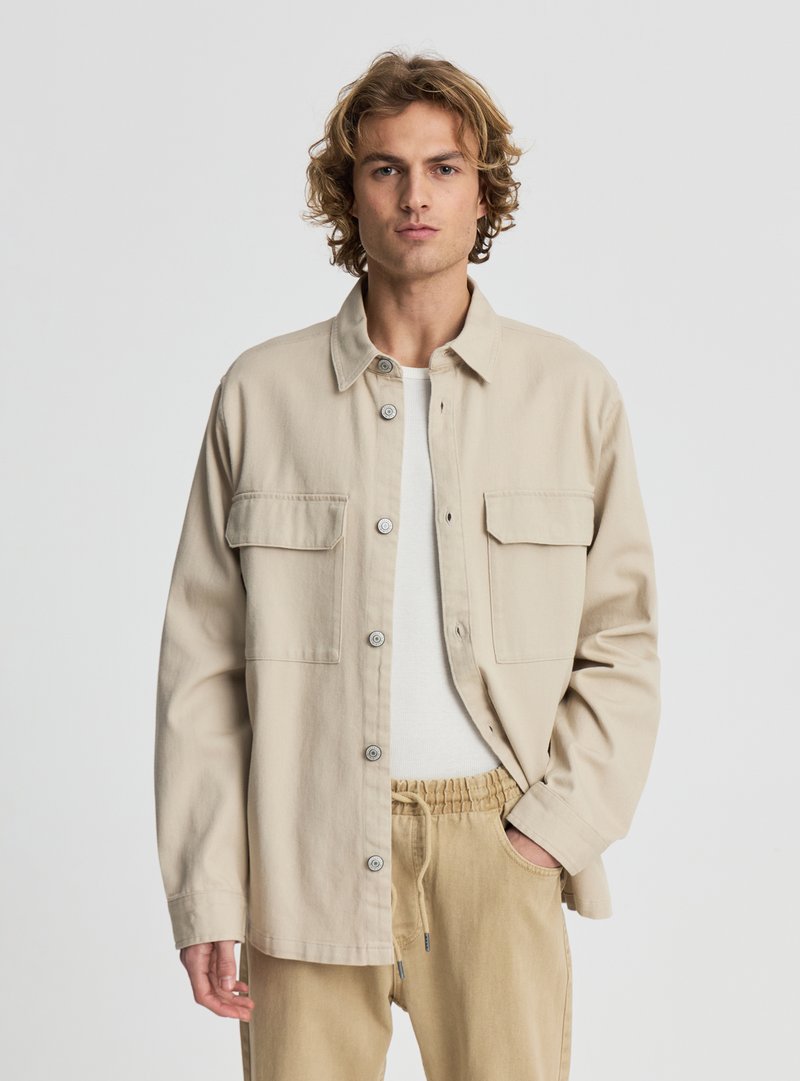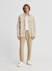 Młody mężczyzna o kręconych włosach, ubrany w beżową kurtkę na guziki na białą koszulę oraz beżowe spodnie z troczkami, stojący na jednolitym tle.