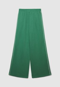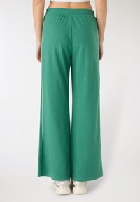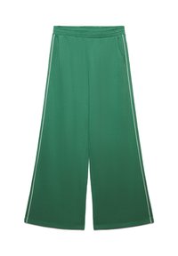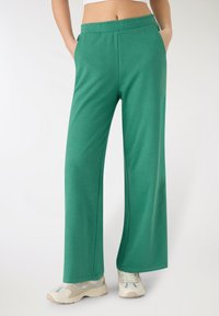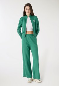 Zielone, szerokie spodnie dresowe z elastycznym paskiem w talii i bocznymi kieszeniami, wykonane z miękkiego materiału, zestawione z sneakersami w neutralnym odcieniu.