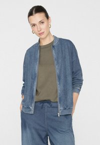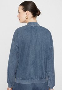 Kurtka bomber z elastycznego denimu z efektem sprania, zamkiem i ściągaczami.