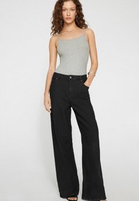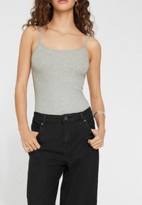 Młoda kobieta z kręconymi brązowymi włosami w dopasowanym, jasnoszarym, bezrękawnym body, stojąca na tle jednolitego, białego tła.