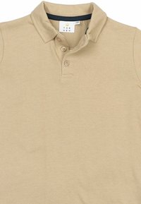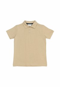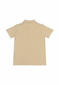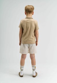 Krótka beżowa koszulka polo, w paski beżowe i białe szorty, białe skarpetki z uśmiechniętą buźką oraz brązowe sandały. Ustawiony pewnie z rękami w kieszeniach.