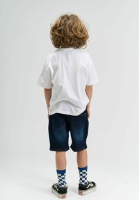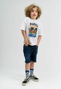 Biała koszulka z graficznym wzorem burgera, niebieskie szorty dżinsowe, czarne sneakersy i niebieskie skarpetki w kratkę. Kręcone włosy.