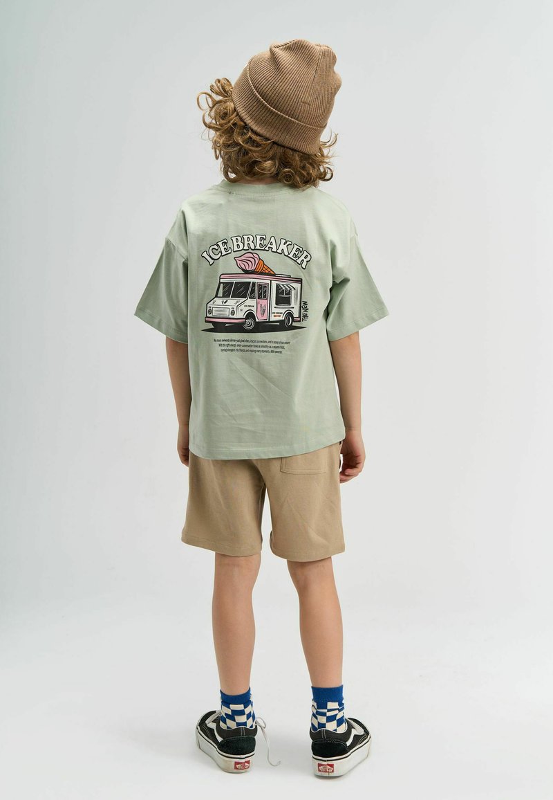 Dziecko z kręconymi włosami noszące brązową czapkę, zieloną koszulkę "Ice Breaker" z grafiką ciężarówki z lodami, beżowe szorty, skarpetki w kratkę i czarne trampki.