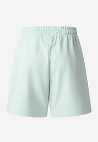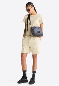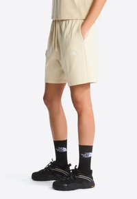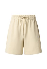 Beżowe szorty z bawełnianej mieszanki, z elastycznym paskiem w talii i sznurkiem do regulacji. Posiadają boczne kieszenie oraz małe białe logo na udzie.